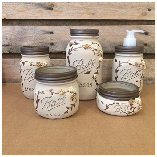 Mason Jar Bathroom Accessories Set 6 Pcs Mason Jar Soap Dispenser 2 Apothecary Jars Toothbrush Holder Ceramic Drain Soap Dish Wire Basket Rustic Farmhouse Decor Bathroom Home Decor Bronze from cdn11.bigcommerce.com Just add a tag + a bit of twine. Wife loves the mason jar theme so i might try and match something like this. Farmhouse 5 piece shabby chic mason jar bathroom set in beachcomber beige flower. #bahtroomlinghting #baño #ideas you are in the right place about diy bathroom decor modern here we offer you the most beautiful pictures about the diy bathroom decor pink you are looking for. Hey sports fans, take a look at these fun sport themed jars. The set pictured is done in vintage chalk paint. It literally only takes a couple of steps! Also, that wood looks like bacon.